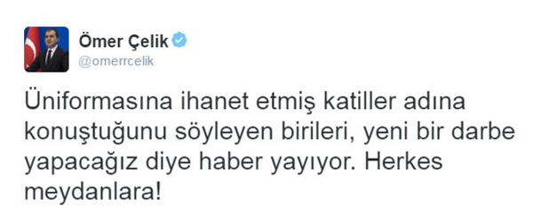 AB Bakanı ve Başmüzakereci Ömer Çelik, Twitter'dan yaptığı açıklamada, vatandaşları meydanları doldurmaları konusunda çağrı yaparak "Üniformasına ihanet etmiş katiller adına konuştuğunu söyleyen birileri, yeni bir darbe yapacağız diye haber yayıyor. Herkes meydanlara!" sözleriyle uyardı.