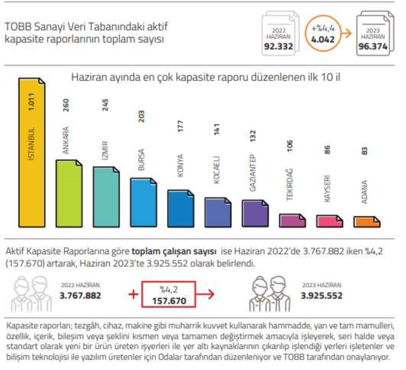 Haziran 2022'de 92 bin 332 olan TOBB Sanayi Veri Tabanı'ndaki aktif kapasite raporlarının toplam sayısı, geçen ay yüzde 4,4 yükselerek 96 bin 374'e ulaştı.