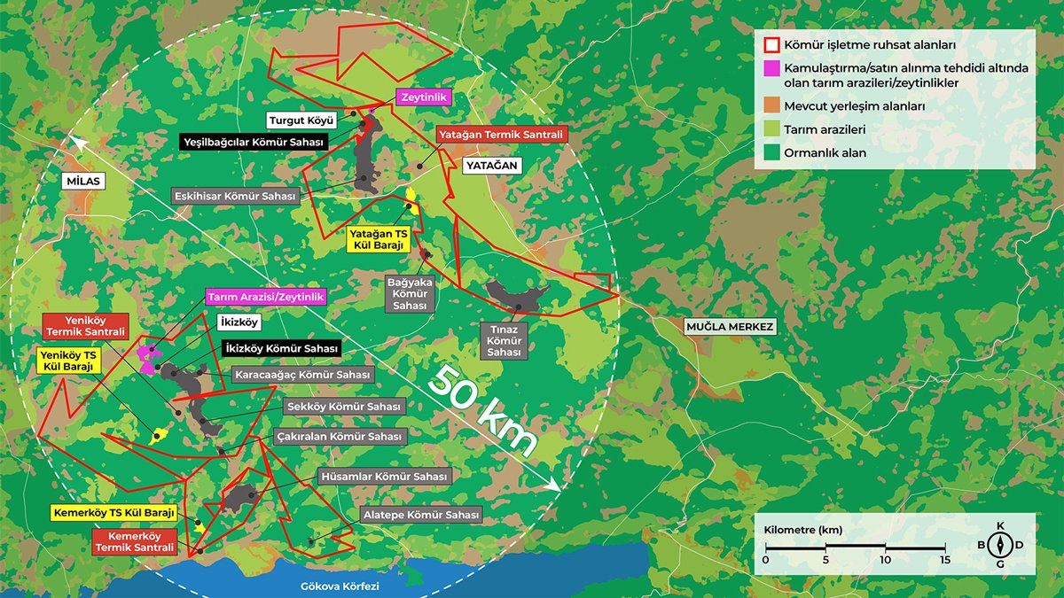 Avukat Tanal, Muğla’daki 3 termik santralin ve açık ocak kömür sahalarının yerlerini gösteren haritayı da paylaştı.