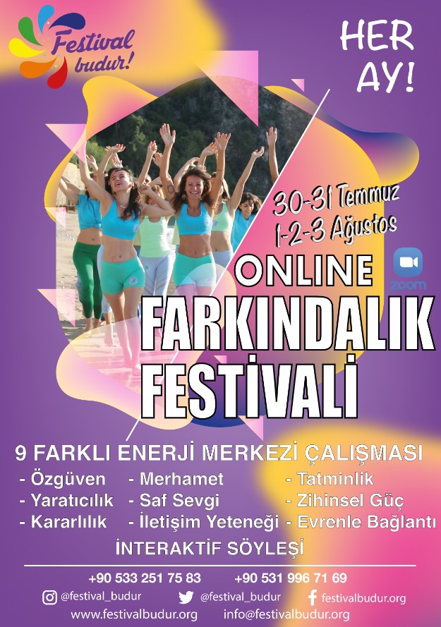 Online Farkındalık Festivali’nde, bağışıklık sistemini güçlendirecek, virüse karşı dayanıklılığı artıracak, oluşan stres ve gerilimi ortadan kaldırıp, moral ve motivasyonu yükseltecek 7 temel, 2 ara enerji merkezi çalışması yer alıyor. Festivale Türkiye’nin ve dünyanın her yerinden ONLINE olarak katılım mümkün.