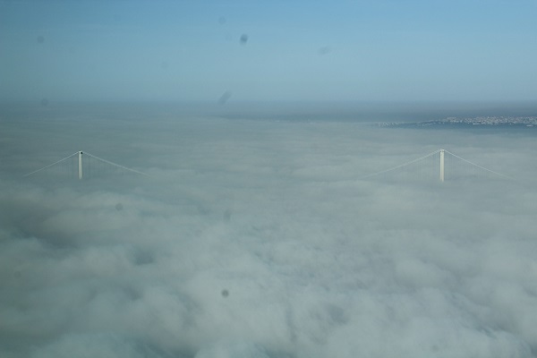 İzmit Körfezi'ni birbirine bağlayan Osmangazi Köprüsü sabah saatlerinden itibaren etkili olan yoğun sisle kaplandı. Havadan görüntülenen köprü sis nedeniyle sadece üst kısımları gözüktü.