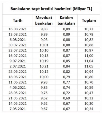 ÖTV düzenlemesi sonrası taşıt kredilerine ilişkin ilk veri Merkez Bankası’ndan geldi. Haftalık para-banka istatistiklerine göre 16 Ağustos haftasında taşıt kredilerinde 62 milyon liralık düşüş yaşandı. 13 Ağustos haftasında 10 milyar 782 milyon TL olan toplam taşıt kredisi tutarı, ÖTV düzenlemesinin hayata geçtiği 16 Ağustos haftasında 10 milyar 720 bin TL'ye geriledi.
