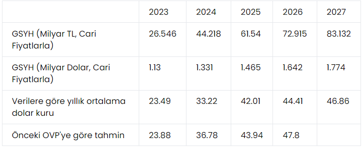 Planda Gayrisafi Yurt İçi Hasıla hem TL bazında hem dolar bazında rakamlarla ifade edildi. Bu rakamlarla hesaplama yapıldığında; yıllık ortalama dolar kuru tahminleri 2024'te 33.22, 2025'te 42.01, 2026'da 44.41 ve 2027'de ise 46.86 olarak ortaya çıktı.