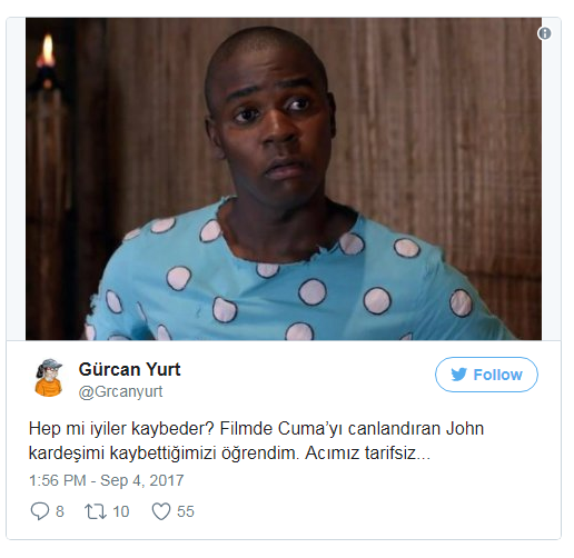 Robinson Crusoe ve Cuma filminin yönetmeni Gürcan Yurt, Nyambi’nin ölümüyle ilgili olarak Twitter hesabından,Hep mi iyiler kaybeder? Filmde Cumayı canlandıran John kardeşimi kaybettiğimizi öğrendim. Acımız tarifsiz ifadesini kullandı.