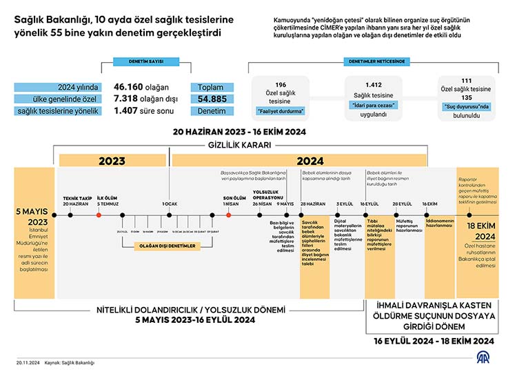 Kamuoyunda "yenidoğan çetesi" olarak bilinen organize suç örgütünün çökertilmesinde CİMER'e yapılan ihbarın yanı sıra her yıl özel sağlık kuruluşlarına yapılan olağan ve olağan dışı denetimler de etkili oldu.