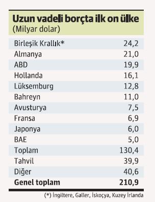 Toplam 210.9 milyar dolar olan borcun 110 milyar doları finansal kuruluşlara, 101 milyar doları da finansal olmayan kuruluşlara ait.