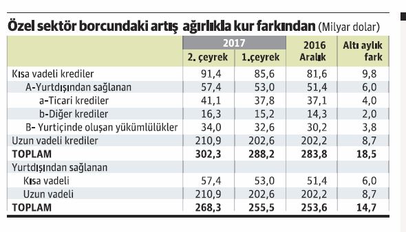 Haziran ayında euro/dolar paritesi 1.14 dolayında oluşmuştu. Parite bugünlerde 1.17 düzeyinin de üstünde bulunuyor. Dolayısıyla eurodaki bu değerlenme ya da diğer bir ifadeyle dolardaki bu zayıflama, özel sektörün dış borcunun haziran sonrasındaki dönemde daha da büyük görünmesine yol açacak.