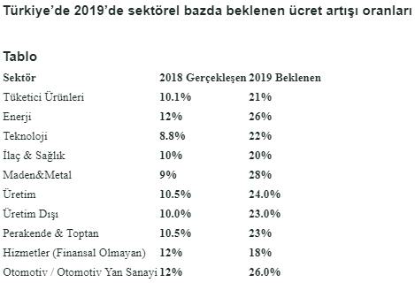 Firmaların değişen iş gücünün sağlık, varlık ve kariyer alanlarındaki ihtiyaçlarını yönetmeleri için teknoloji odaklı çözümler sunan ve danışmanlık veren Mercer, iş dünyasındaki ücret, zam eğilimleri ve yan haklar uygulamalarını ortaya koyan ‘2019 Ücret ve Yan Haklar Araştırması’nın sonuçlarını açıkladı. 385 firmanın katıldığı araştırmaya göre, enflasyon beklentisi ile birlikte ücret artışı beklentisi de arttı. Türkiye’den hızlı tüketim ürünleri, perakende, dayanıklı ürünler, enerji, teknoloji, ilaç, kimya ve kağıt, hizmet, üretim, lojistik, sigorta gibi farklı sektörlerden, ağırlıklı olarak uluslararası firmaların katılımı ile gerçekleşen araştırmanın sonuçlarına göre; özel sektörün Eylül 2018’de yüzde 16 olarak öngördüğü 2019 ücret artış oranı beklentisi, Ekim 2018 itibariyle ortalama yüzde 22 olarak gerçekleşecek.