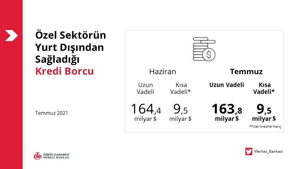 Türkiye Cumhuriyet Merkez Bankası tarafından açıkanan verilere göre, Temmuz sonu itibarıyla, özel sektörün yurt dışından sağladığı toplam kredi borcu, 2020 yıl sonuna göre 130 milyon ABD doları azalarak 173,3 milyar ABD doları oldu. Vadeye göre incelendiğinde, 2020 yıl sonuna göre, uzun vadeli kredi borcunun 110 milyon ABD doları artarak 163,8 milyar ABD doları kısa vadeli kredi borcunun (ticari krediler hariç) ise 240 milyon ABD doları azalarak 9,5 milyar ABD doları düzeyinde gerçekleştiği gözlendi.