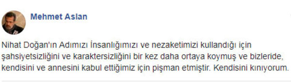 Tecavüze uğrayarak vahşice öldüren Özgecan Aslan'ın ardından sosyal medya hesabından yaptığı paylaşımla dikkat çeken Nihat Doğan, Özgecan'ın babası Mehmet Aslan ile buluştu. Buluşmadan bir gün sonra ise Mehmet Aslan'dan ilginç bir çıkış geldi. Facebook hesabından açıklama yapan Aslan, "Nihat Doğan'ın adımızı insanlığımızı ve nezaketimizi kullandığı için şahsiyetsizliğini ve karaktersizliğini bir kez daha ortaya koymuş ve bizleri de, kendisini ve annesini kabul ettiğimiz için pişman etmiştir. Kendisini kınıyorum" mesajını paylaştı.