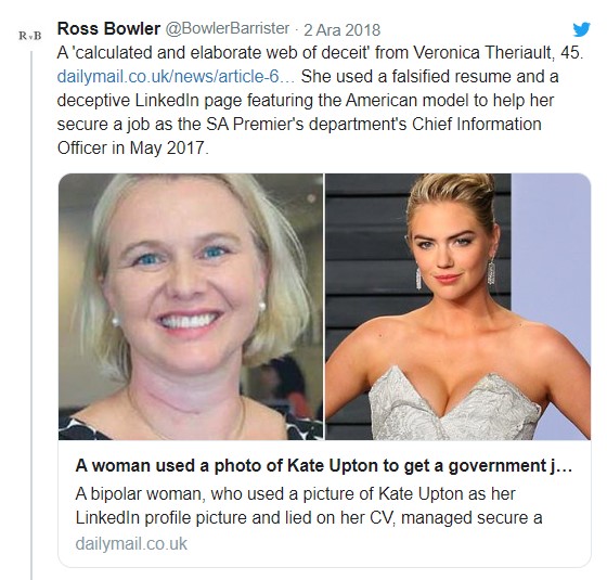 Kadının yalanları bununla da bitmedi. Mahkeme bilgilerine göre Veronica isimli kadın Linkedln profil fotoğrafı olarak supermodel Kate Upton’ın fotoğrafını kullanmıştı.