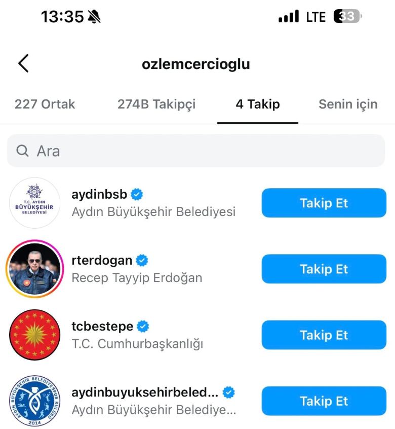 Çerçioğlu Instagram üzerinden Aydın Büyükşehir Belediyesi'ne ait 2 hesap, Cumhurbaşkanlığı, Cumhurbaşkanı ve AKP Genel Başkanı Recep Tayyip Erdoğan'ı takip ediyor.