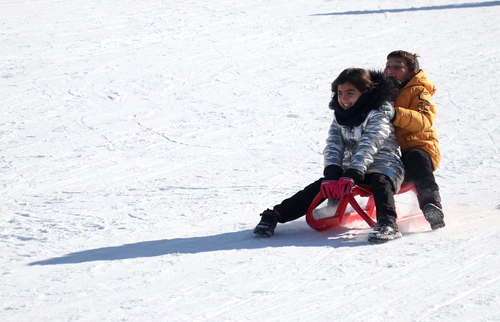 Palandöken'e gelen çok sayıda ziyaretçi, güneşli havada 70 santimetre sıkıştırılmış karda kayak, snowboard yaptı, çocuklar ise hafta sonu tatilini fırsat bilerek aile ve arkadaşlarıyla kızakla kaymanın keyfini yaşadı.