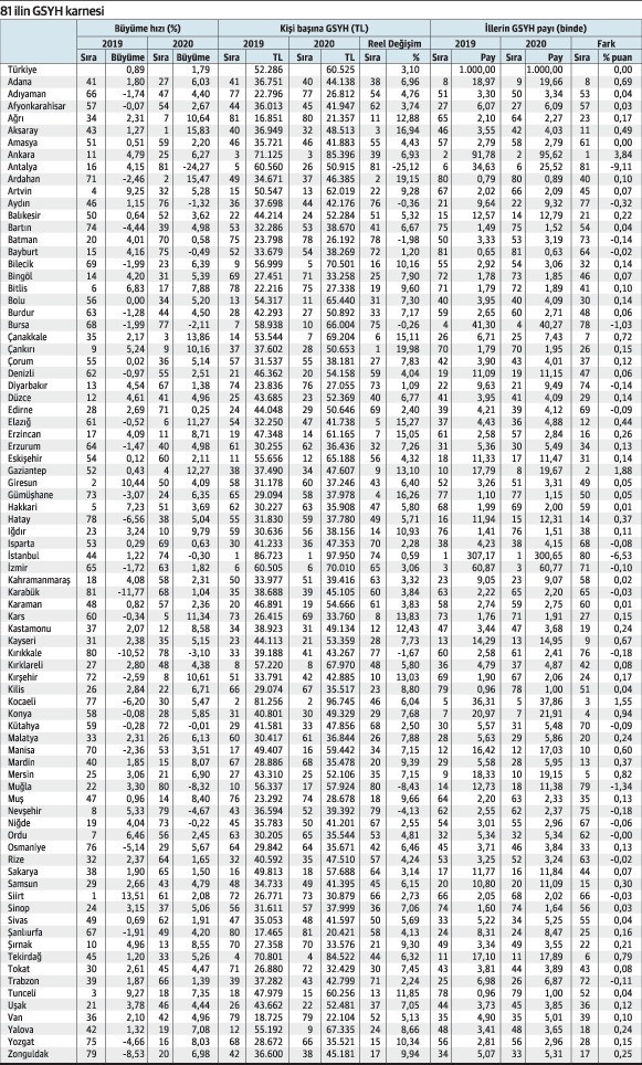 Türkiye İstatistik Kurumu’nun (TÜİK) 2020’ye ilişkin il bazındaki gayrısafi yurtiçi hasıla (GSYH) verileri, Kovid-19 salgını karşısında 81 ilin ekonomisinin nasıl bir sınav verdiğini analiz etmemize imkan sunması açısından önem taşıyor. Söz konusu veriler, 81 ilin ekonomik tahlil sonuçları, Kovid-19 yılında ekonomisi yatağa düşen illerin zaafiyet noktalarını, salgından daha az etkilenerek süreci ayakta geçiren illerin dayanıklılık kaynaklarının tespit edilmesine yarayacak ipuçları veriyor.