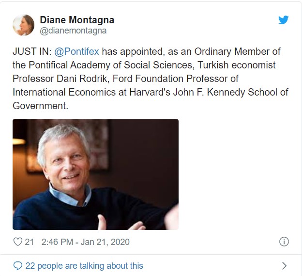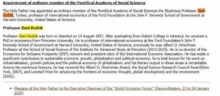 Vatikan'ın günlük bültenlerinin yayımlandığı internet sitesinde, Papa'nın Prof. Dr. Rodrik'in akademide iktisat ve ekonomi dersleri vereceği kaydedildi. Bültende ayrıca Rodrik'in kısaca öz geçmişinden bahsedildi.