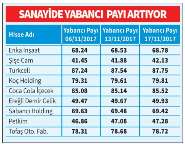 Yabancılar son 10 gün içerisinde banka hisselerinde paylarını azalttı, sanayi ve hizmet sektöründe paylarını artırdı. Vakıflar Bankası, İş Bankası (C), Halk Bankası, Yapı ve Kredi Bankası, Akbank hisselerinde yaşanan satışlar iki hafta boyunca sürdü. Enka İnşaat, Şişe Cam, Turkcell, Koç Holding, Coca Cola İçecek ve Ereğli Demir Çelik ise yabancıların paylarını en fazla artırdıkları hisseler.