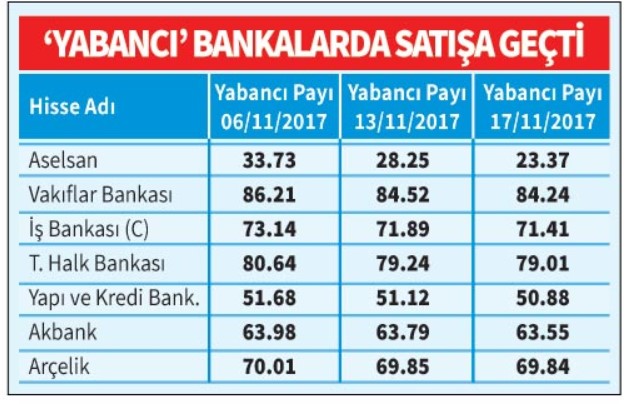 Kasım ayının ikinci haftasında yabancıların güçlü satış dalgası yaşanıyor. Türkiye Cumhuriyet Merkez Bankası (TCMB) haftalık menkul kıymet istatistiklerine göre, yurt dışında yerleşik kişiler, 10 Kasım haftasında net 513,6 milyon dolarlık hisse senedi, 532,6 milyon dolarlık Devlet İç Borçlanma Senedi (DİBS) ve 32,4 milyon dolarlık Özel Sektör Tahvil ve Bonosu (ÖST) sattı. Toplamda 1 milyar dolarlık satış gerçekleşti. Hisse senetlerinde bir haftada yaşanan yarım milyarlık satış, en son 2008 ve 2011 ve 2015 krizlerinde yaşanmıştı. Banka hisselerinde 17 Kasım haftasında satışların sürmesi ivme kaybetse de yabancı çıkışının önümüzdeki hafta açıklanacak verilerde görülmesine neden olabilir.
