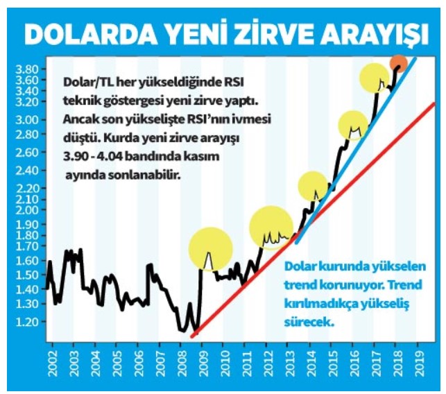 Dolar/TL kurunda 11 Eylül’de 3.38’lerden başlayan yukarı hareket, kuru 3.90’a kadar taşıdı. Dolar hâlâ 11 Ocak’ta test edilen 3.94’lerin altında bulunuyor. En çok merak edilen konu ise kurda yeni bir zirvenin oluşup oluşmayacağı. Fiyat seyri yükselen trendin korunduğunu gösteriyor. Bu da dolar/TL kurunda yükselişin devam edeceği anlamına geliyor. Fakat dolar/TL zirveye yaklaştıkça teknik göstergelerde uyumsuzluk başladı. Kur yükselirken çıkışta olan ve her defasında yeni zirve yapan göstergeler dolar kuru yeni zirve yapmasına rağmen yükselişi onaylamıyor. Kurun son atağı ve zirve seviyesi kasım ayında oluşabilir. Dolar/TL’de yukarı harekette hedef 4.04 olacaktır. Kurum değerlendirmelerine baktığımızda Unicredit Bank, yılsonunda dolar/TL kurunun 4.15 olmasını bekliyor. Morgan Stanley’e göre ise dolar, daha güçlü bir küresel büyümenin Fed’in faiz artışları ile gelecek destekten daha ağır basacak olmasıyla altı yıl boyunca zayıflama tehdidi ile karşı karşıya bulunuyor.