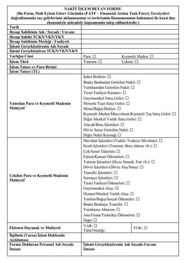 2 milyon TL ila 20 milyon TL arası nakit işlemlerde ise müşterinde Nakit İşlem Beyan Formu doldurması istenecek. Nakit İşlem Beyan Formunda işlemin mahiyetine ilişkin somut bilgi içermeyen, genel mahiyette “diğer” veya “bireysel ödeme” gibi başka seçeneklerin olması ve bunların müşteri tarafından seçilmesi durumunda, işlemin mahiyetine ilişkin olarak en az 20 karakter uzunluğunda işlem açıklaması temin edilecek.