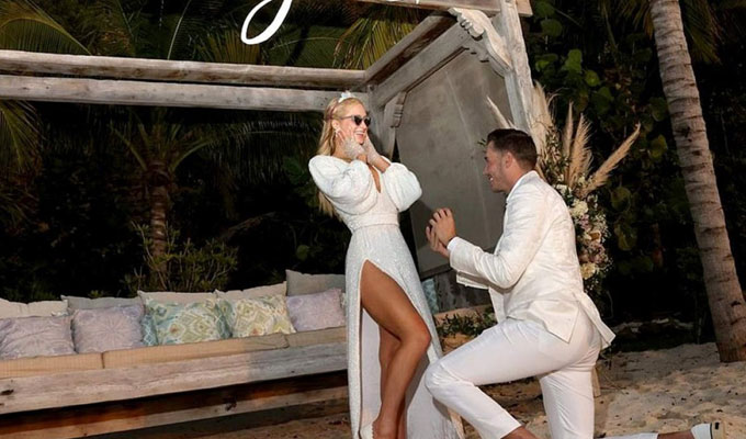 Plajda yapılan nişan esnasında çekilmiş fotoğrafları Instagram sayfasında paylaşan Paris Hilton, "Doğum günüm için tropikal cennete özel bir yolculuk planladı. Sahilden akşam yemeğine doğru yürürken, Carter bizi çiçeklerle süslenmiş bir kulübeye götürdü ve diz çöktü. Evet, sonsuza kadar evet dedim. Sonsuza dek birlikte olmayı tercih edeceğim başka kimse yok." açıklamasını yaptı.