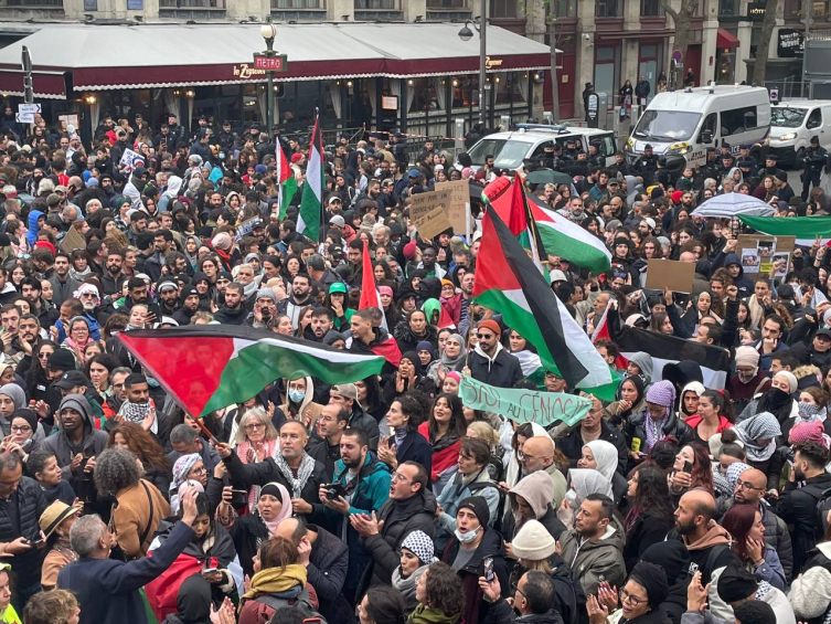 Gösteride, "Gazze'nin çocukları, Filistin'in çocukları, insanlık öldürülüyor", "Gazze, Paris seninle", "Soykırımı durdurun" ve "Ateşkes" sloganları atılıyor.