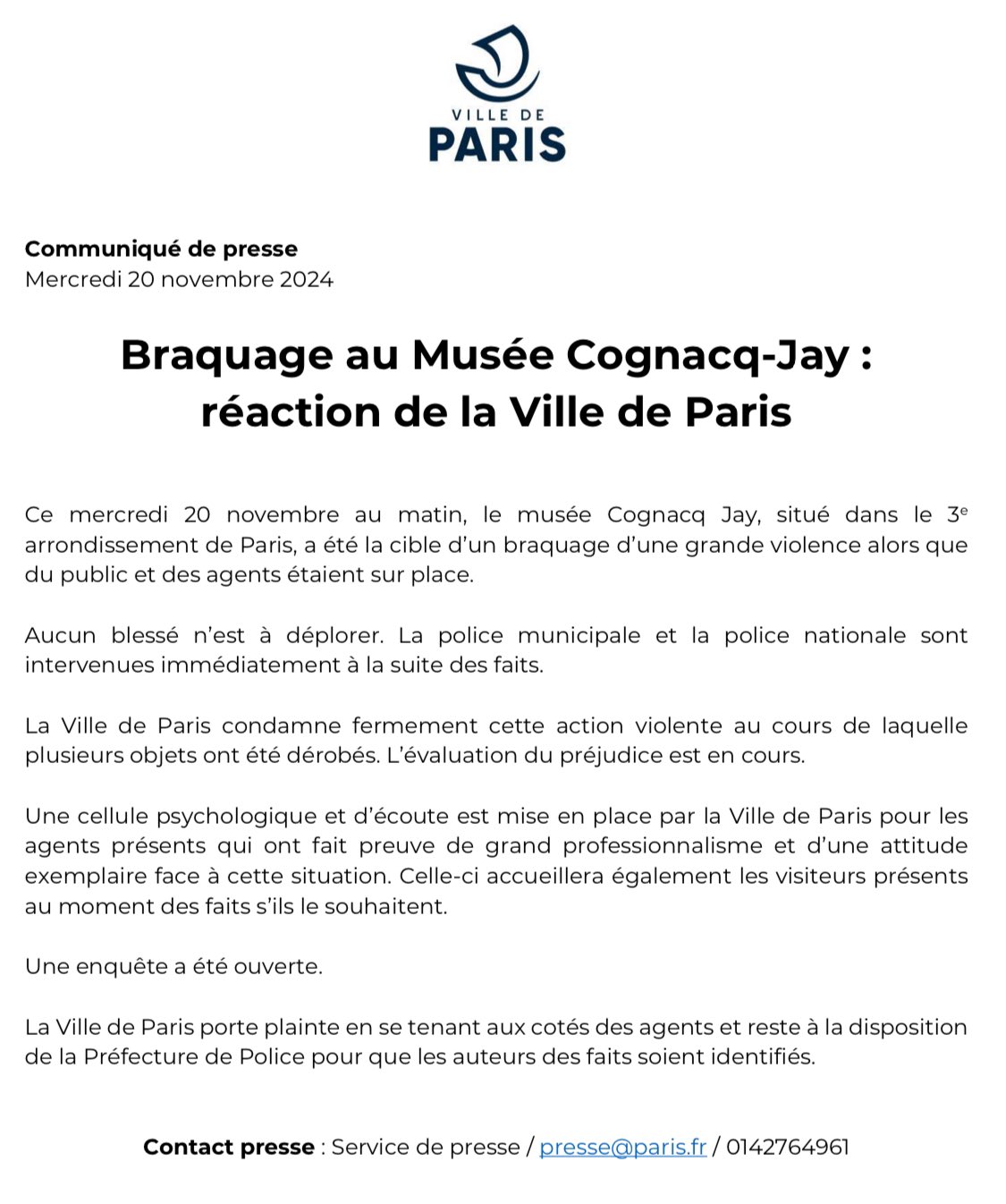 1. yüzyıl sanat eserleri ve objelerinden oluşan geniş bir koleksiyona ev sahipliği yapan Cognacq-Jay Müzesi, olay nedeniyle kapılarını kapattığını ve 10 Aralık’ta yeniden açılacağını açıkladı. Paris makamları, olay sırasında müzede bulunan ziyaretçi ve personele psikolojik destek sağlanacağını açıkladı.