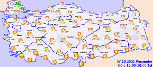 Meteoroloji Genel Müdürlüğü tarafından yapılan son değerlendirmelere göre bugün yurdun kuzey kesimlerinin parçalı ve yer yer çok bulutlu, Ordu ve İstanbul çevreleri ile Kırklareli'nin kuzey kesimlerinin yerel olmak üzere sağanak yağışlı, diğer yerlerin az bulutlu ve açık geçeceği tahmin ediliyor.