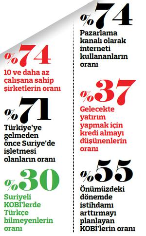 Yüzde 55’i mevcut durumlarını koruduğunu ve yüzde 34’ü büyüdüğünü belirtiyor. Suriyeli girişimcilerin yüzde 76’sı Suriye’de savaş bittikten sonra da Türkiye’deki işlerini muhafaza ederek Suriye’ye açılmayı planlıyor. Suriyeli KOBİ sektör tahlilinde toptan ve perakende ticaret yüzde 39’la ilk sırada. Bunu yüzde 19’la imalat ve yüzde 10’la konaklama ve yiyecek hizmetleri takip ediyor. Suriyeli imalatçılar daha çok Gaziantep’te yer alırken, İstanbul’daki şirketler genelde konaklama ve yiyecek hizmetleriyle ilgileniyor.