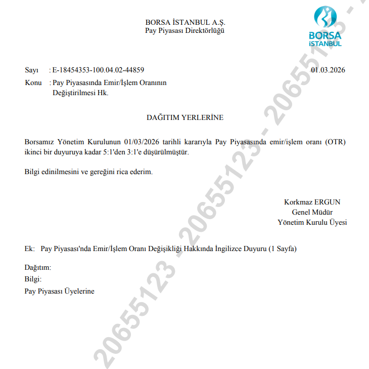 Borsa İstanbul AŞ, Pay Piyasası'nda emir/işlem oranını (OTR) ikinci bir duyuruya kadar 5:1'den 3:1'e düşürdü.