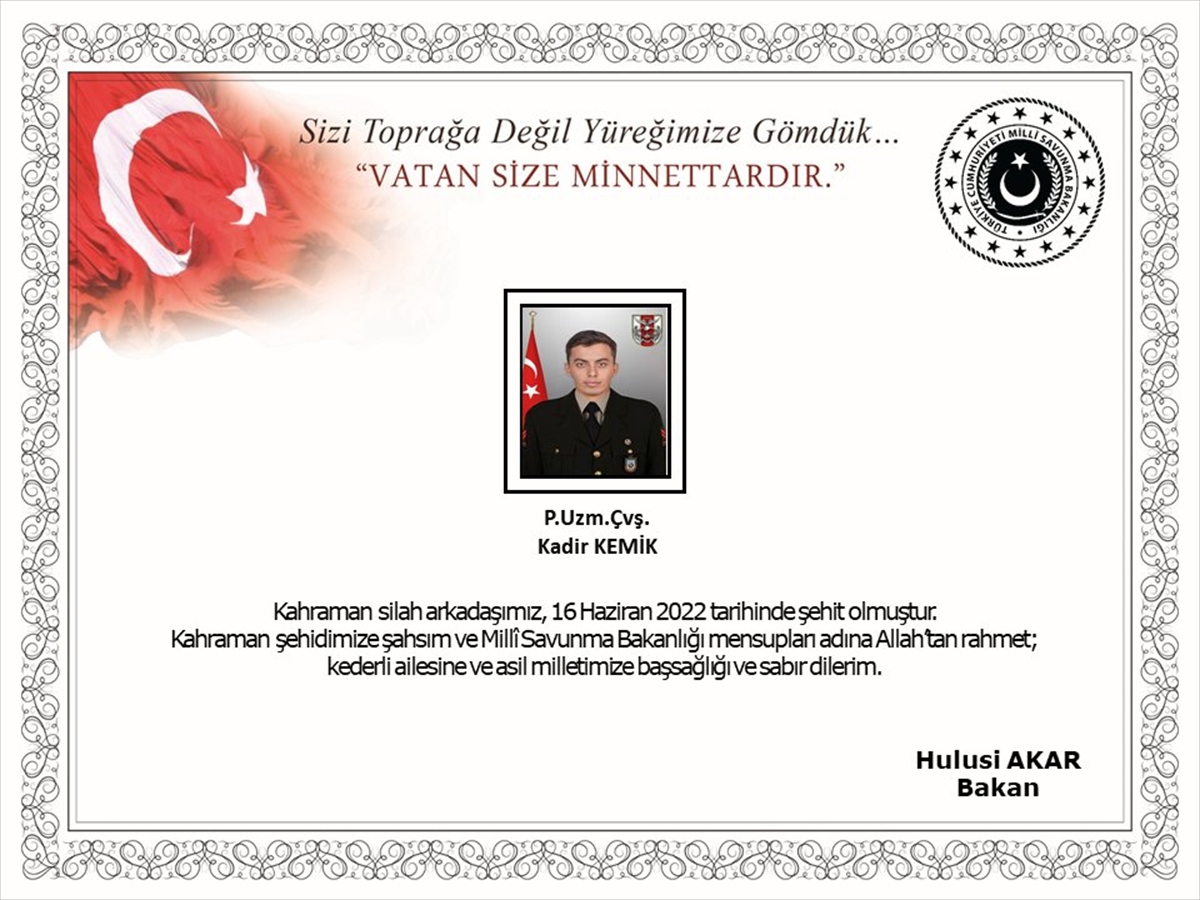 Bakanlıktan yapılan açıklamada, "Pençe-Kilit operasyonu bölgesinde 16 Haziran 2022 tarihinde bir üs bölgemize bölücü terör örgütü mensuplarınca açılan taciz ateşi sonucunda kahraman silah arkadaşımız P.Uzm.Çvş. Kadir Kemik yaralanarak derhal hastaneye sevk edilmiş, ancak yapılan tüm müdahalelere rağmen kurtarılamayarak şehit olmuştur." denildi