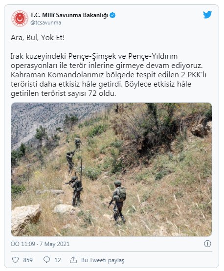 Irak kuzeyindeki Pençe-Şimşek ve Pençe-Yıldırım operasyonları ile terör inlerine girmeye devam ediyoruz. Kahraman Komandolarımız bölgede tespit edilen 2 PKK’lı teröristi daha etkisiz hâle getirdi. Böylece etkisiz hâle getirilen terörist sayısı 72 oldu.
