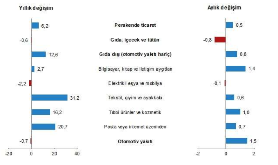 Sabit fiyatlarla perakende satış hacmi (2015=100) 2022 yılı Şubat ayında bir önceki yılın aynı ayına göre %6,2 arttı. Aynı ayda gıda dışı satışlar (otomotiv yakıtı hariç) %12,6 artarken, gıda, içecek ve tütün satışları %0,6, otomotiv yakıtı satışları %0,7 azaldı.