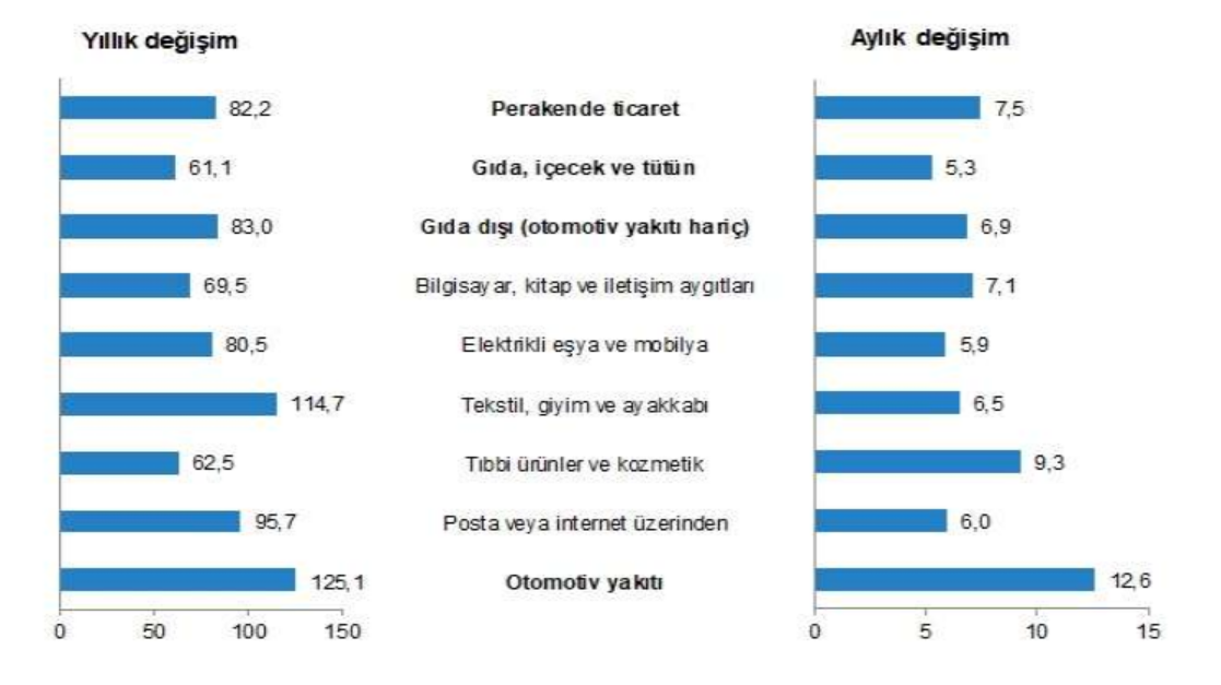 Cari fiyatlarla perakende ciro (2015=100) 2022 yılı Şubat ayında bir önceki yılın aynı ayına göre %82,2 arttı. Aynı ayda gıda, içecek ve tütün satışları %61,1, gıda dışı satışlar (otomotiv yakıtı hariç) %83,0, otomotiv yakıtı satışları %125,1 arttı.