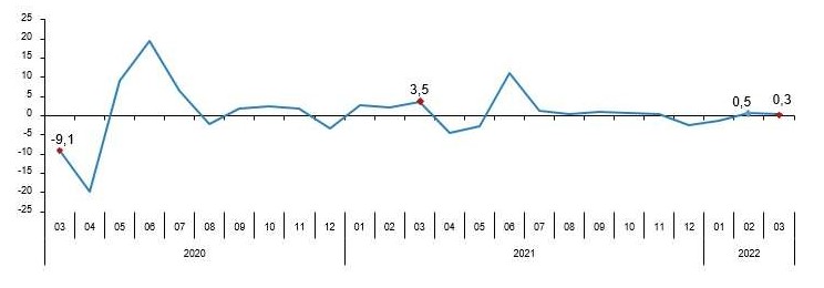 Sabit fiyatlarla perakende satış hacmi 2022 yılı Mart ayında bir önceki aya göre %0,3 arttı. Aynı ayda gıda, içecek ve tütün satışları %4,3, gıda dışı satışlar (otomotiv yakıtı hariç) %0,1 artarken, otomotiv yakıtı satışları %5,1 azaldı.