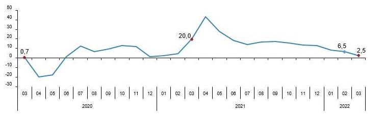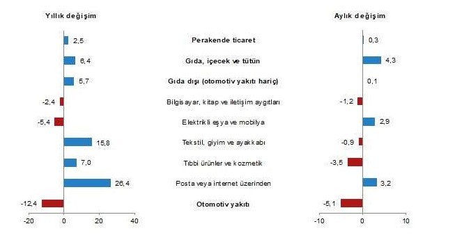 Türkiye İstatistik Kurumu (TÜİK) tarafından yapılan açıklamaya göre, sabit fiyatlarla perakende satış hacmi (2015=100) 2022 yılı Mart ayında bir önceki yılın aynı ayına göre %2,5 arttı. Aynı ayda gıda, içecek ve tütün satışları %6,4, gıda dışı satışlar (otomotiv yakıtı hariç) %5,7 artarken, otomotiv yakıtı satışları %12,4 azaldı.