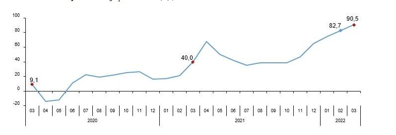 Cari fiyatlarla perakende ciro 2022 yılı Mart ayında bir önceki yılın aynı ayına göre %90,5 arttı. Aynı ayda gıda, içecek ve tütün satışları %80,8, gıda dışı satışlar (otomotiv yakıtı hariç) %79,2, otomotiv yakıtı satışları %150,5 arttı.