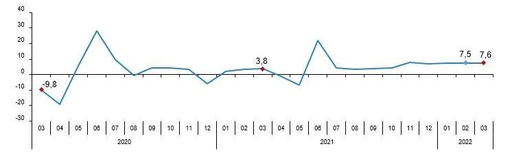 Cari fiyatlarla perakende ciro 2022 yılı Mart ayında bir önceki aya göre %7,6 arttı. Aynı ayda gıda, içecek ve tütün satışları %10,2, gıda dışı satışlar (otomotiv yakıtı hariç) %4,8, otomotiv yakıtı satışları %11,4 arttı.