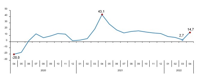Cari fiyatlarla perakende ciro (2015=100) 2022 yılı Nisan ayında bir önceki aya göre %8,4 arttı. Aynı ayda gıda, içecek ve tütün satışları %4,6, gıda dışı satışlar (otomotiv yakıtı hariç) %10,4, otomotiv yakıtı satışları ise %8,7 arttı.