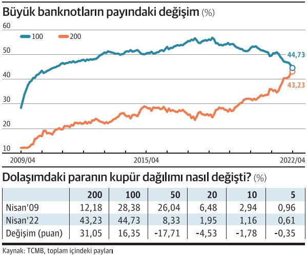 Şebnem Turhan'ın Dünya'daki haberine göre yüksek enflasyon dolaşımdaki parada küçük kupürlü banknotların artık yavaş yavaş azalmasına neden oldu. Merkez Bankası verileri dolaşımda bulunan para miktarında artık 100 ve 200 TL’lik banknotların çok daha öne çıktığını ortaya koyuyor. Ocak 2009’de yüksek enflasyonun geride bırakılmasının ardından paradan 6 sıfır atılarak dolaşıma giren YTL’nin yerine gelen TL’de en yüksek banknot 200 TL olmuştu. Nisan 2009’da yani 13 yıl önce tüketici enflasyonu yüzde 6,13 seviyesinde ve 200 TL’lik kupürlerin toplam dolaşımdaki payı da yüzde 12,18 seviyesindeydi. Bu yıl nisanda yüzde 69,97’ye çıkan tüketici enflasyonunun gölgesinde 200 TL’lik banknotların dolaşımdaki para miktarı içindeki payı yüzde 43,23’e yükseldi. Bu 13 yılda 31.05 puanlık bir artışın yaşandığına işaret ediyor.