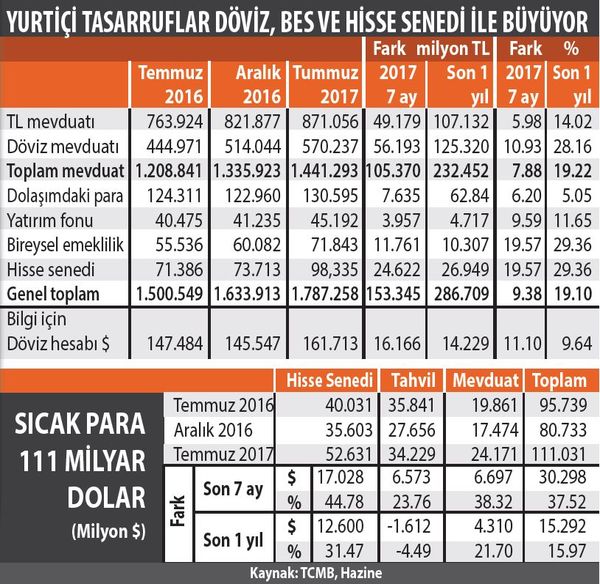 Yurtiçi yerleşiklerin finansal varlıklarındaki büyüme ise enflasyonun üzerinde olmaya devam ediyor. 7 ayda 153 milyar veya yüzde 9 artan finansal varlık toplamı 1 trilyon 787 milyar liraya yükseldi. Son bir yıllık artış ise tutar olarak 287 milyar lira ile yüzde 19 düzeyinde. Dolayısıyla burada enflasyonun 10 puan üzerinde veya bir katı kadar artış söz konusu. Artışın bir bölümü getiriden kaynaklı, faiz getirisi ve borsada değer artışı gibi. Bir kısmı da yeni tasarruflardan.