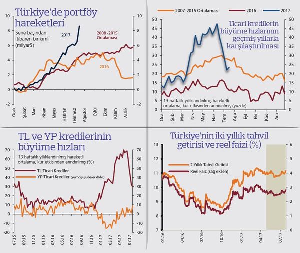 - Merkez Bankası’na ait grafiklere göre 2007-2015 ortalaması ile 2016 yılı kur etkisinden arındırılmış kredi büyümesi birbirine paralel ve yatay seyrediyor. Ancak grafiğe de anlam kazandıran 2017 zıplaması. Bu zıplama haziran ortasından itibaren yerini gerilemeye bıraktı, temmuz ayında da tarihsel ortalamasının altına indi.