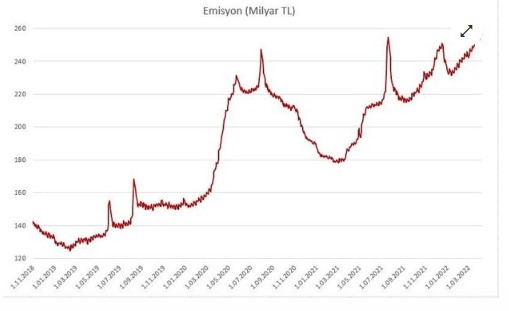 Yayımlanan son verilere göre 08 Nisan 2022 itibarıyla Türkiye'de dolaşımdaki para, teknik terimiyle emisyon hacmi 260 milyar TL'yi aştı ve 260 milyar 394 milyon 648 bin 787,5 TL ile tüm zamanların rekoru kırıldı.
