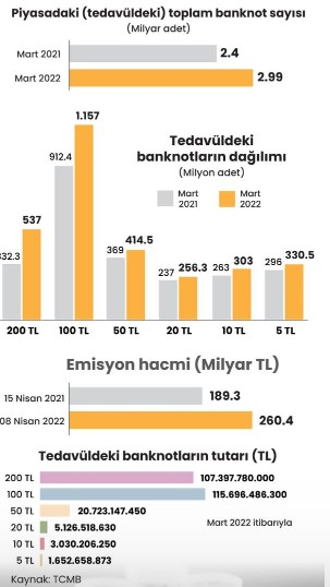 Emisyon artışındaki aslan payı ise 100 TL ve 200 TL'lik banknotlarda görüldü. Mart 2021'de 332.3 milyon adet olan tedavüldeki 200 TL sayısı, mart 2022 itibarıyla 537 milyon adede çıktı. 100 TL'lik banknotların sayısı da 912.4 milyon adetten 1 milyar 157 milyon adete çıktı.