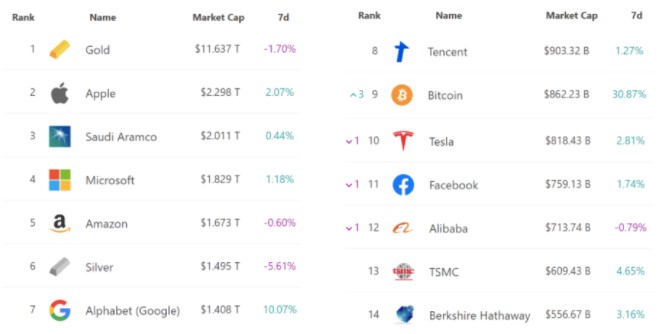BTC, bu haftaki yükseliş ile Tesla'yı geçerek alınıp satılabilir tüm varlıklar listesinde dokuncu sıraya yükseldi.