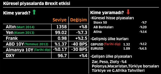 Sterlin rekor hızda düştü ve Avrupa hisse senetleri 2008'den bu yana en keskin düşüşünü gerçekleştirmeye yöneldi. Yen dolar karşısında güçlendi ve 2013'ten bu yana ilk kez 100 seviyesini aştı. Altın yedi yılı aşkın sürenin en hızlı yükselişini yaptı ve ABD'nin gösterge Hazine tahvilinin faizi 2009'dan bu yana en sert düşünü gerçekleştirdi.