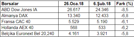 Bu gelişme borsalarda da satışları ve dolayısıyla düşüşleri tetikledi. Aşağıdaki tabloda ABD ve Euro Bölgesi borsalarında son günlerde yaşanan düşüşler görülüyor.