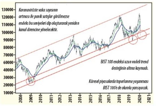 Küresel bazda hisse senetlerinin çöküşüyle birlikte Borsa İstanbul da en sert düşüşlerinden birini yaşadı. Pazartesi günü petrol şoku ile açılan piyasalardaki satışlar çarşamba günü Türkiye’de koronavirüs vakası görüldüğünün açıklanmasıyla arttı. Borsa İstanbul haftaya 109 bin seviyesinden başlarken hafta içi 93 bine kadar geriledi. Haftalık kapanışını ise 95 binden yaptı. Endeksin haftalık değer kaybı yüzde 12.77 oldu. Endeks uzun vadeli yükselen kanalı aşağı kırmadı. Küresel piyasalarda satışların durulması ve koronavirüs vaka sayısındaki artış hızının yükselmemesi halinde satış baskısı zayıflar ve toparlanma gözlenebilir. Dolar/TL kuru ise hafta içinde 6.25 seviyesindeki direncini kırarak 6.33’e yükseldi. Gram altın 319 liraya geriledi. 19 Mart’ta TCMB toplantısı var. Toplantıda faizin inmesi bekleniyor. Faizlerdeki iniş TL varlıklara yönelimi zayıflatabilir. Dolar/TL 6.25’in altına kaymadıkça yükseliş eğilimini koruyacaktır.