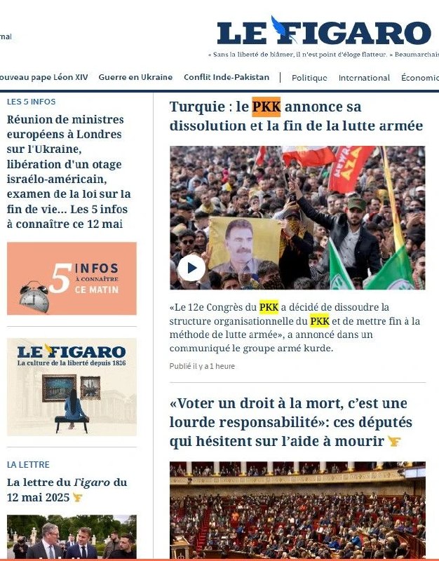 Fransız gazetesi Le Figaro "Türkiye: PKK feshini ve silahlı çatışmanın sona erdiğini duyurdu" başlıklı haberinde Cumhurbaşkanı Tayyip Erdoğan'ın "Öcalan'ın çağrısının tarihi fırsat" olarak nitelediği sözlerine yer verdi.