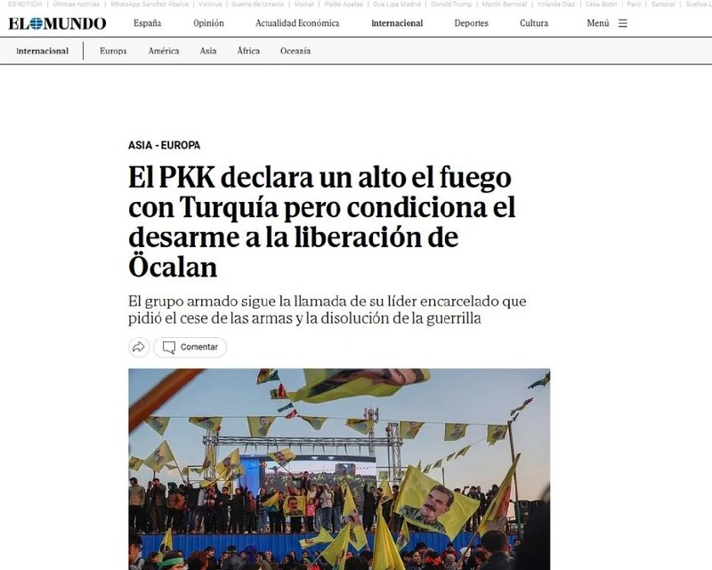 İspanyol yayın kuruluşu El Mundo "PKK Türkiye'yle ateşkes ilan etti ama silah bırakmasındaki koşul Öcalan'ın serbest bırakılması" başlıklı haberinde, Kandil'dekilerin "örgütün elebaşı Abdullah Öcalan'la yüz yüze görüşmedikleri sürece silah bırakmayacaklarını" yazdı. Silah bırakma kararının siyasi partiler tarafından iyimserlikle karşılandığını yazan gazete, öte yandan PKK'nın Kuzey Suriye'de faaliyet gösteren uzantısı Suriye Demokratik Güçleri'nin (SDG) çok daha temkinli yaklaştığı belirtildi. (Nefes)