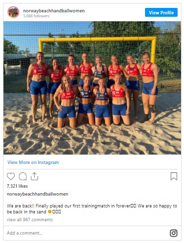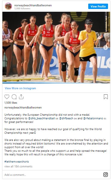 Erkeklerin atlet-şortla oynamasına izin verilirken, kadınların karınlarını açıkta bırakan üst ve yukarıya açılı-dar kesimli bikini altı giymeye mecbur bırakılmasına karşı çıkan Norveç milli kadın plaj hentbolu takımı, Euro 2021 turnuvası yetkililerine regl oldukları zaman kendilerini rahatsız hissettirdiği ve cinsel obje olarak gösterdiği gerekçesiyle maçlarda bikini yerine şort giymek istediklerini belirttikleri başvuru yaptı. Ancak Avrupa Hentbol Federasyonu, diskalifiye ya da para cezası alacaklarına dair uyarıyla yanıt verdi.